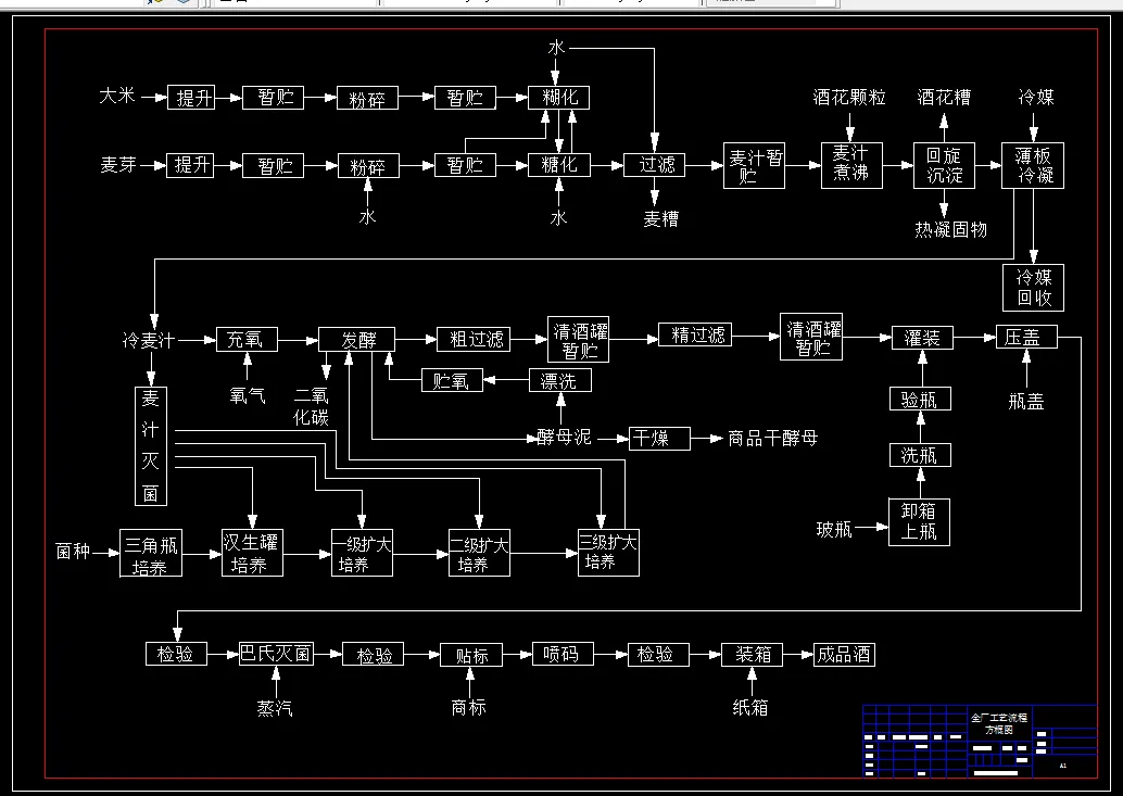 绘制全厂工艺流程方框图一张、糖化车间带控制点工艺流程图一张、糖化车间平面图布置图一张、糖化车间立面图布置图一张。