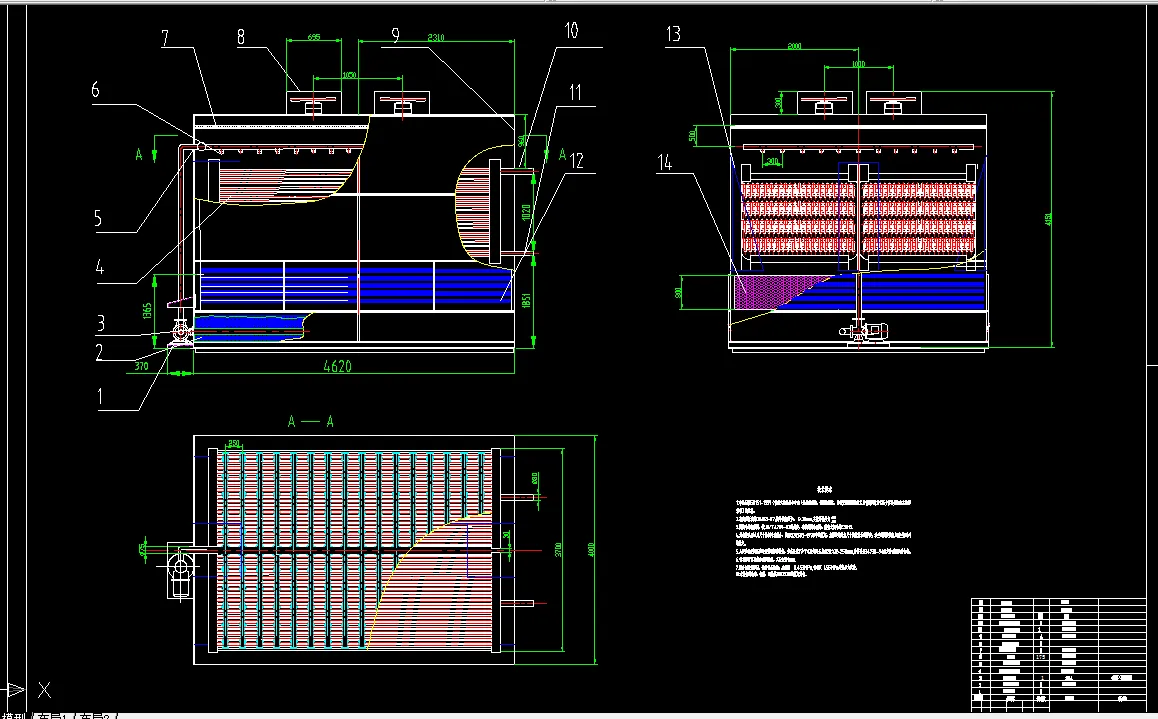 已知制冷工况:冷水进水温度12℃,冷水出水温度7℃;水箱温度31℃。综合考虑选择壳管式换热器,即蒸发式冷凝器,干式蒸发器,并对冷凝器和蒸发器进行了设计。其换热面积分别为143.56m2和40.7m2 ,分别有8.8%和6.25%的面积裕度,符合要求。冷凝器为管长4000mm,共10管程;蒸发器为三角形布管,总管数300根,横过中心线管数20根,共20排。
