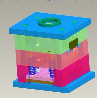 具体设计为:材料选用ABS;注射机选用时尽量选用国标注射机。该制件上下部分均需要抽芯机构,故需要设计上下层的侧型芯,具体通过滑块带动来完成制件的抽芯过程,进而顺利完成制件的脱模,最后有顶杆将制件顶出模外。
