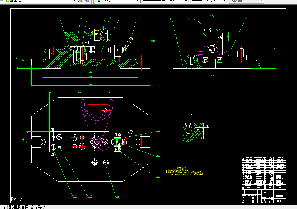 此次设计是对高低档的拨叉零件的加工工艺和夹具设计,其零件为铸件,具有体积小,零件复杂的特点,由于面比孔易加工,在制定工艺规程时,就先加工面,再以面为基准来加工其它,其中各工序夹具都采用专用夹具,特别的对于加工大头孔、槽和钻小头孔斜面小孔的工序中,选一面两销的定位方式,并以操作简单的手动夹紧方式夹紧,其机构设计简单,方便且能满足要求。