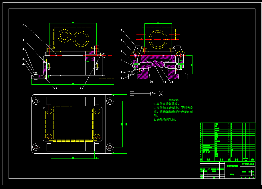 在设计加工 150孔的专用夹具时,以箱座底面为基准,采用一面两销定位,通过连接螺栓将箱盖和箱座联结,并以定位销将其定位。为了降低成本、减少装夹时间,采用凸轮联动夹紧装置。逆时针转动手柄时,在拉伸弹簧的作用下,压板松开,放入工件,顺时针转动手柄带动凸轮推动推杆,从而压紧工件。