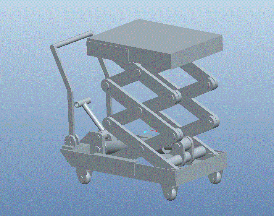100KG手动液压升降平台的设计含proe三维及8张CAD图带设计计算说明。设计的液压升降平台是手动的,最开始将它的结构设计出来;之后对货品的具体大小进行调查,将货物的模型建立起来,这样升降平台的整体结构大小就都确定了;之后,将升降平台的力学模型建立起来,升降平台机构所处地点不一样,那么还要分析他们的受力,对杆件,销轴,螺栓的强度进行校核;之后设计升降平台液压系统,最后一步用CAD软件将升降平台的装配图,零件图都画出来,用Pro/e将三维模型建立起来。