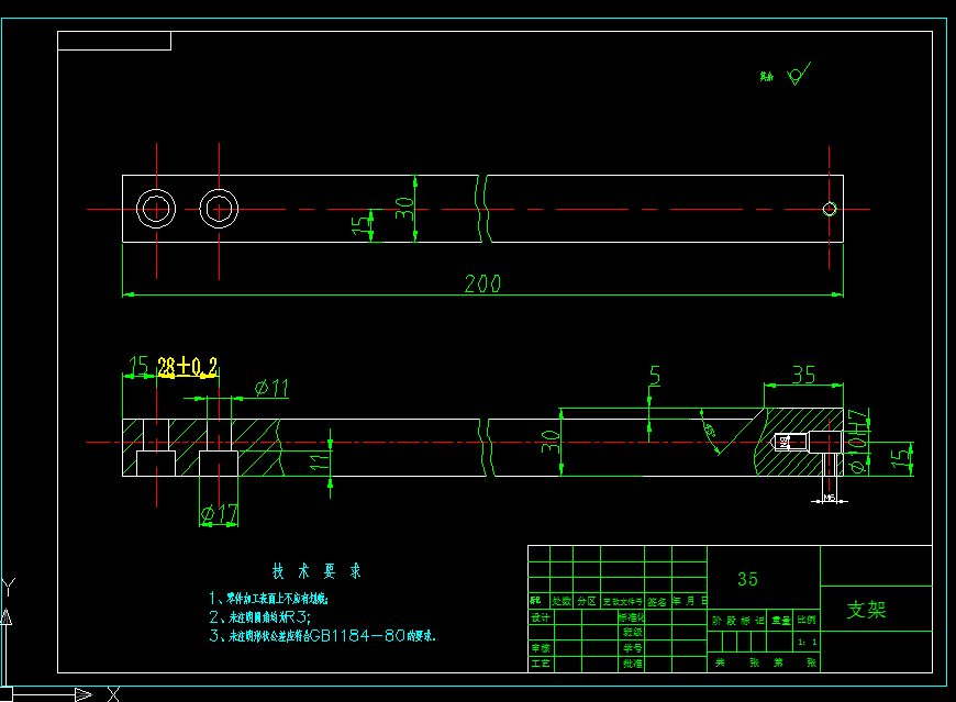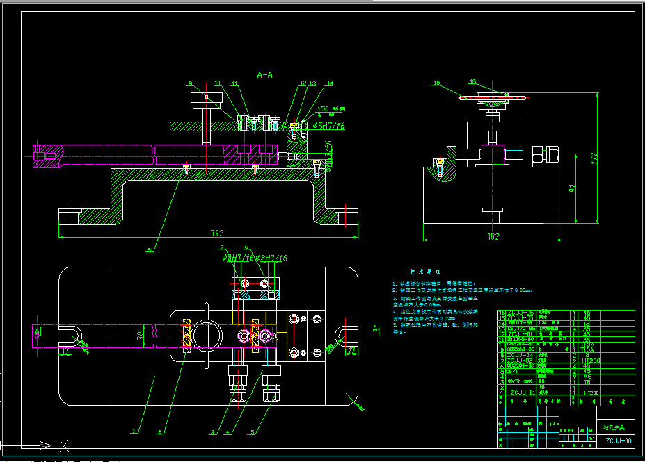 本设计是基于支架零件的加工工艺规程及一些工序的专用夹具设计。支架零件的主要加工表面是平面及孔系。一般来说,保证平面的加工精度要比保证孔系的加工精度容易。因此,本设计遵循先面后孔的原则。并将孔与平面的加工明确划分成粗加工和精加工阶段以保证孔系加工精度。基准选择以支架的支承孔作为粗基准,以端面与两个工艺孔作为精基准。主要加工工序安排是先以支承孔系定位加工出顶平面,再以端面平面与支承孔系定位加工出工艺孔。在后续工序中除个别工序外均用顶平面和工艺孔定位加工其他孔系与平面。支承孔系的加工采用的是坐标法镗孔。整个加工过程均选用组合机床。夹具选用专用夹具,夹紧方式多选用气动夹紧,夹紧可靠,机构可以不必自锁,因此生产效率较高,适用于大批量、流水线上加工,能够满足设计要求。