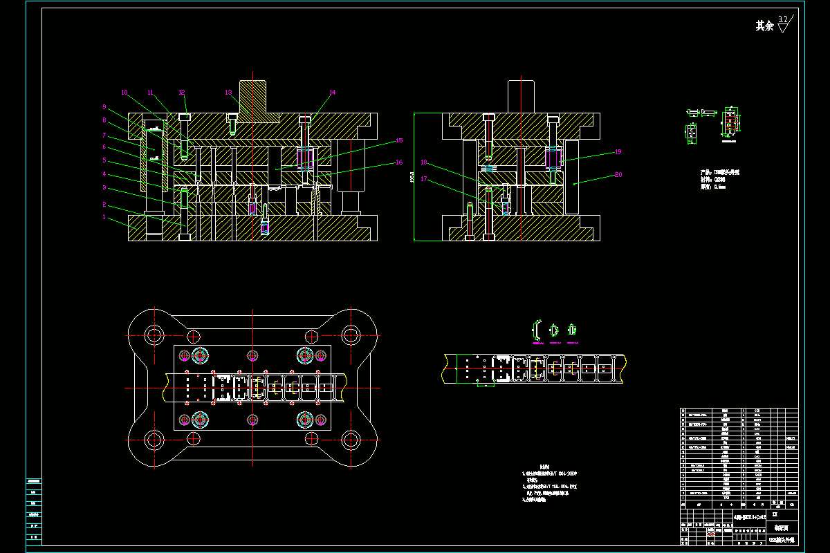 通过对USB插头接口零件进行工艺分析,确定了冲压工艺方案及模具结构形式,然后对模具进行总体设计,接下来是对模具设计进行基本参数计算,如排样设计、计算压力中心、计算冲裁力、工作零件的刃口尺寸计算等,最后是根据设计数据选择典型模具零件、模具组合、以及压力机。采用AutoCAD软件绘制了USB插头级进模的装配图和非标准零件图,并撰写了设计说明书。
