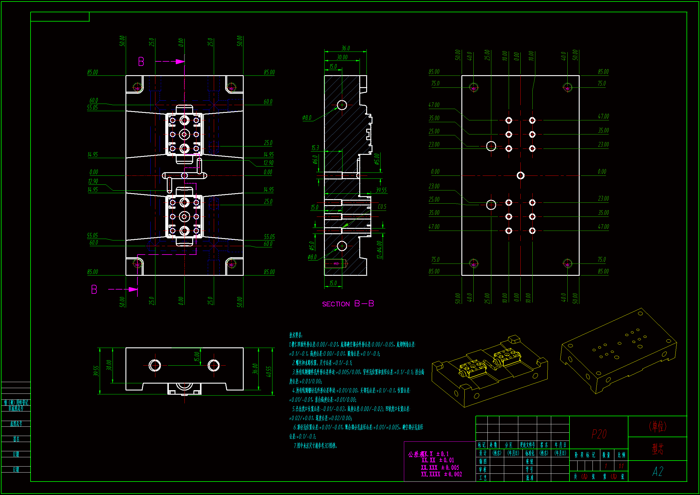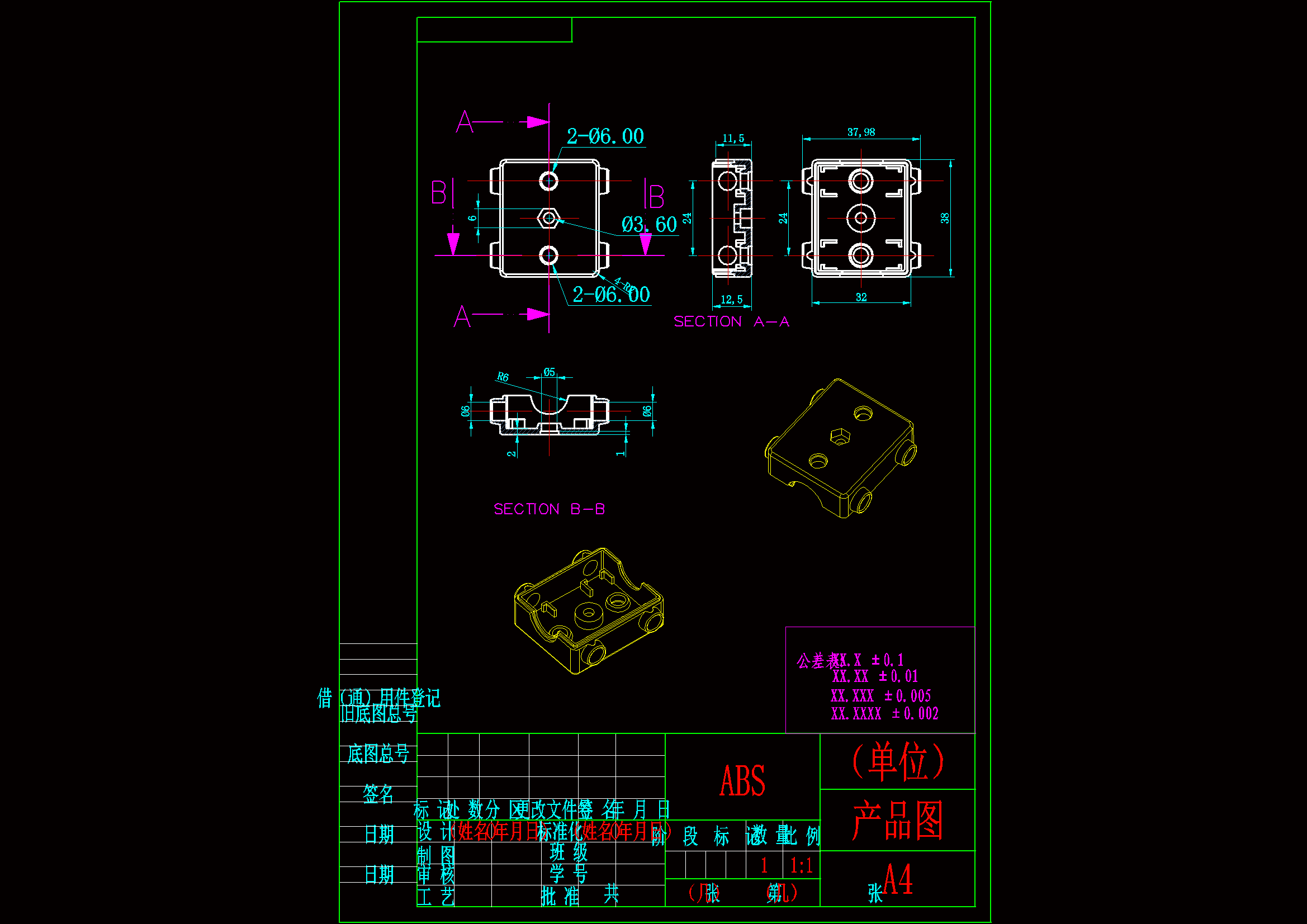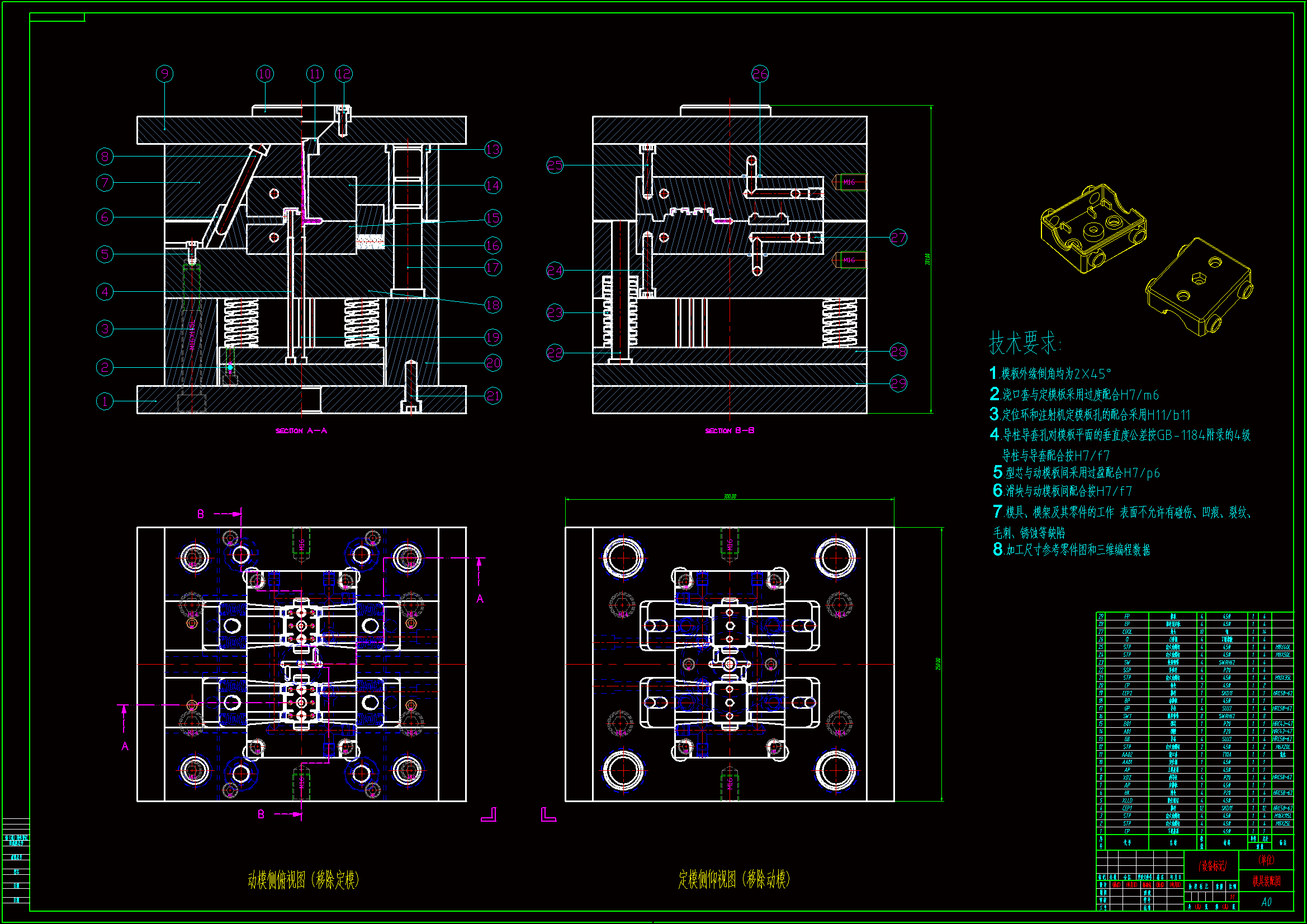 通过对机盖塑件的设计分析,设计出该塑件的模具。在整个模具设计过程中,涉及到了塑件的结构设计、注塑机和模架的选择及注塑机的一些重要工艺参数的校核,并详细叙述了模具设计中的分型面设计、浇注系统设计、成型零件设计、脱模机构设计和冷却系统设计,最后还对成型零件制订加工工艺方案。 在模具设计过程中,采用了Pro/ENGINEER、AutoCAD等著名的设计分析软件,采用这些软件进行设计分析,优化了设计的参数和缩短了设计时间,大大提高了设计效率。