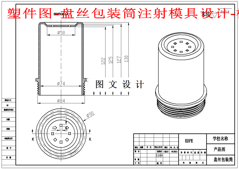 日常生活用品飞速发展,在本次课题中,选择了日常生活用品的典型零件,盘丝包装筒来作为本次设计。分析了盘丝包装筒结构,选择一个适合这个盘丝包装筒的材料。根据盘丝包装筒的结构,设定并且选择了分型面,确定了模具型腔的出模数量为一模四腔盘丝包装筒产品。在浇注系统的设计上面,我采用了常见的侧浇口浇注系统,这种浇注系统的流程短,流道的废料少,经济性满足要求,在盘丝包装筒的顶部有叉头,底部有螺纹需要采用抽芯机构才可以成型,这个机构增加了模具设计的难度,但是这是盘丝包装筒必须有的。在成型系统的型芯和型腔机构的设计上面,采用了镶嵌式的型芯和型腔,这种型芯和型腔更好的加工和更换维修,可以保证模具有更高的寿命,针对这个盘丝包装筒模具,还设计了一种能够环绕盘丝包装筒塑件的冷却系统,让成型的周期尽可能的缩短。在顶出系统的设计上面,设计了模具中最常用的推板顶出机构来让盘丝包装筒更加容易脱模。结构上完成分析和设计以后,使用三维的软件,通过建模,实现模具的全三维总装图的绘制,通过使用二维软件AUTO CAD,绘制模具的二维总装图,塑件图,非标零件工程图,在最后,进行注塑机的选择,确定锁模力,注塑量等相关尺寸的校核