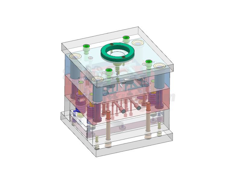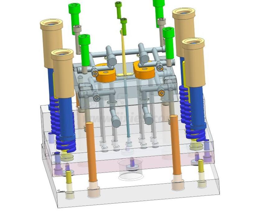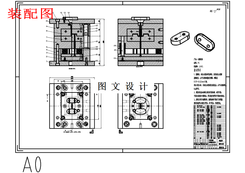 因为塑件结构比较简单,尺寸较小,考虑实际生产效率的需要,使用一模二腔,并最终使用AutoCAD、UG设计软件,完成模具装配图方案的三维设计,并绘制注塑模具总装图及相关零件图。