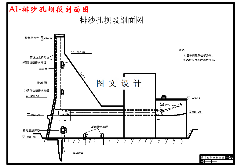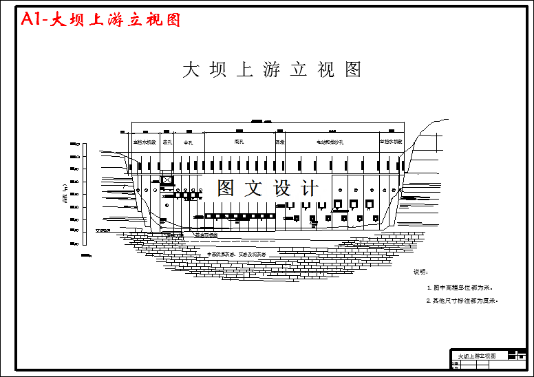 本设计的主要任务主要是:枢纽布置,坝体布置,剖面设计,水力计算,稳定校核及细部构造设计,地基处理方案。(1)根据地质、地形条件和枢纽建筑物的作用,通过分析比较进行坝线、坝型的选择,确定最适宜建坝位置。(2)确定坝顶高程和坝体长度,简略绘制枢纽平面布置图及上游立视图。(3)进行泄水能力验算,在满足安全泄流要求的前提下,确定各孔口尺寸及墩厚。(4)进行各坝段的剖面设计,包括:拟定坝体剖面,设计孔口尺寸,进口曲线等,并绘制设计图。(5)进行消能计算和压坡线计算,确定其满足要求。(6)进行抗滑及应力验算,确保坝体安全。(7)进行细部构造设计和地基处理设计,包括:混凝土强度分区、分缝、止水、廊道、排水及开挖、清理、灌浆、断层处理,并绘制有关设计图。