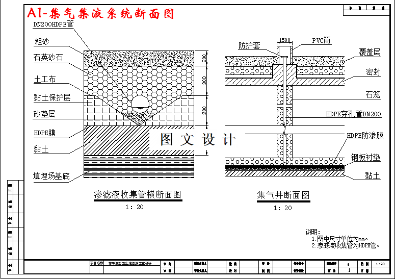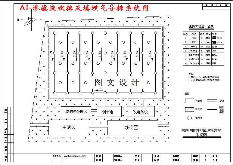 本工程设计所涉及的工程地质为:裸露的地层为棕黄色粉质黏土,渗透系数为2.0×10-5~8.6×10-5cm/s,厚度为3~5m.。如果直接用来填埋垃圾,而不采取防渗措施,将对地下水的卫生安全造成威胁。必须设置人工防渗系统。在人工合成防渗膜中选用了性能较优,国内外使用经验较多的高密度聚乙烯(HDPE)防渗膜。根据中华人民共和国行业标准生活垃圾卫生填埋技术规范中6.0.4 :粘土厚度≥100cm、渗透系数不大于1.0×10-5cm/s,库区底部可采用双层衬里的防渗系统,地下水导流层大于30cm, 符合双层衬里的设计要求。库区边坡采用单层衬里结构的防渗系统,满足黏土厚度大于75cm,渗透系数不大于1.0×10-5cm/s条件,可以适用本填埋场防渗系统的设计要求。综上所述,库区底部选用双层衬里结构,库区边坡选用单层衬里结构,防渗膜选用人工合成膜高密度聚乙烯(HDPE)。