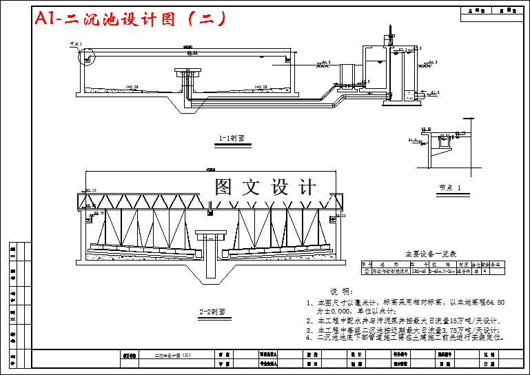 二沉池是活性污泥处理系统的重要组成部分,其作用是泥水分离,使得混合液澄清,浓缩和回流活性污泥。其运行效果将直接影响活性污泥系统的出水水质和回流污泥浓度。在本次设计中为了提高沉淀效率,节约土地资源,降低筹建成本,采用机械刮泥吸泥迹的辐流沉淀池,进出水采用中心进水,周边出水,以获得较高的容积利用率和较好的沉淀效果。辐流式沉淀池中心处设中心管,污水从池底的进水管进入中心管,通过中心管壁的开孔流入池中央,中心管处用穿孔整流板围成流入区,使污水均匀流动,污水曝气池出水并接DN1600的铸铁管进入配水井,从配水井接DN1000的铸铁管,在二沉池前接阀门,后接DN1000的二沉池入流管。采用中心进水,中心管采用铸铁管,出水端用渐扩管,为了配水均匀,沿套管周围设一系列潜孔,并在套管外设稳流罩。