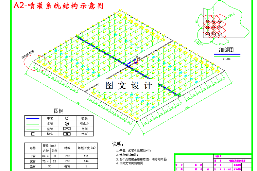灌溉系统是指从水源取水到田间喷洒灌水整个工程设施的总称。一般由水源工程、水泵及动力设备、输水管道系统和喷头等部分组成。喷灌系统可按不同方法分类。若按系统获得压力的方式可分为机压喷灌系统和自压喷灌系统;按系统设备组成分为管道式喷灌系统和机组式喷灌系统;按喷灌系统中主要组成部分是否移动的程度可分为固定式、移动式和半固定式三类。