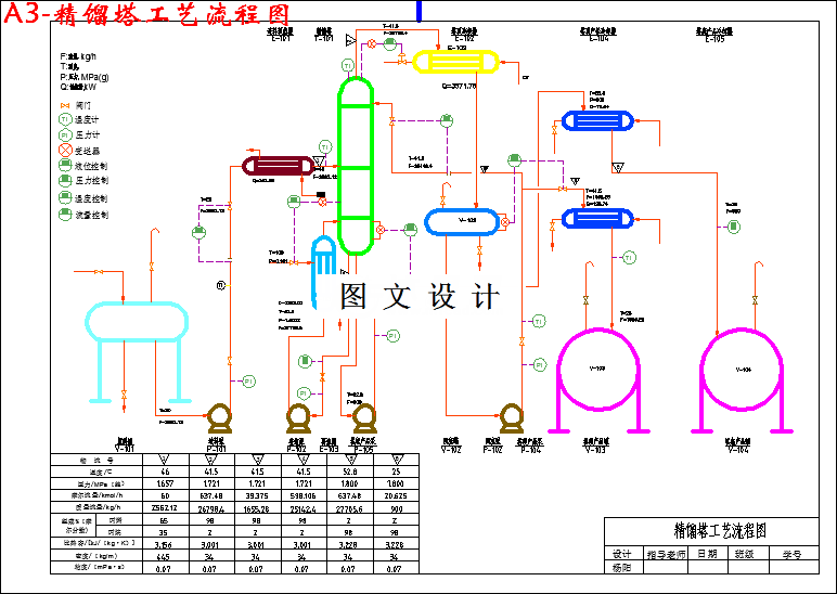 精馏塔是进行精馏的一种塔式汽液接触装置,又称为蒸馏塔。有板式塔与填料塔两种主要类型。根据操作方式又可分为连续精馏塔与间歇精馏塔。蒸气由塔底进入,与下降液进行逆流接触,两相接触中,下降液中的易挥发(低沸点)组分不断地向蒸气中转移,蒸气中的难挥发(高沸点)组分不断地向下降液中转移,蒸气愈接近塔顶,其易挥发组分浓度愈高,而下降液愈接近塔底,其难挥发组分则愈富集,达到组分分离的目的。由塔顶上升的蒸气进入冷凝器,冷凝的液体的一部分作为回流液返回塔顶进入精馏塔中,其余的部分则作为馏出液取出。塔底流出的液体,其中的一部分送入再沸器,热蒸发后,蒸气返回塔中,另一部分液体作为釜残液取出,从而实现了两种物质的分离。本次设计装置的工艺流程是蒸气由塔底进入,与下降液进行逆流接触,两相接触中,下降液中的易挥发(低沸点)组分不断地向蒸气中转移,蒸气中的难挥发(高沸点)组分不断地向下降液中转移,蒸气愈接近塔顶,其易挥发组分浓度愈高,而下降液愈接近塔底,其难挥发组分则愈富集,达到组分分离的目的。由塔顶上升的蒸气进入冷凝器,冷凝的液体的一部分作为回流液返回塔顶进入精馏塔中,其余的部分则作为馏出液取出。塔底流出的液体,其中的一部分送入再沸器,热蒸发后,蒸气返回塔中,另一部分液体作为釜残液取出,从而实现两种物质的分离。