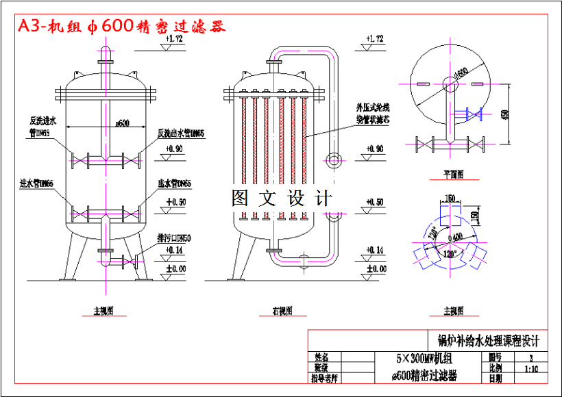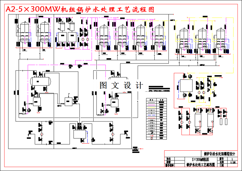 此次水处理课程设计根据机组要求对其水处理系统进行设计计算,基本能够达到改善锅炉补给水水质,使锅炉的水汽品质控制在合格指标以内,以满足锅炉补给水的要求,从而减缓锅炉炉内的结垢和腐蚀,延长化学清洗周期。目的在于进一步巩固和加深我们的理论知识,并结合实践,学以致用。通过对火力发电厂锅炉补给水处理课程设计,使我们了解火力发电厂锅炉补给水处理的流程设备及管道的流向。补给水处理工艺流程是根据原水为中山电力公司水样、出水水质要求和机组容量的大小等因素综合确定的。 (1)原水水质悬浮物含量(实际含量126.00mg/L)大于50mg/L。因此需要采用澄清池,过滤系统应用单层(石英砂)无阀滤池,采用接触混凝过滤方式,在反洗过程中,可以自动进行,无阀滤池的滤后水位位于滤池上部,便于操作人员观察,若水质不合格,能及时发现,及时处理,确保出水水质达标,其截污能力大,运行周期长,运行中水头损失增长较慢,实践中应用效果良好。 (2)原水碳酸盐硬度为1.74mmol/L<3mmol/L因此无需采用弱酸阴离子交换器。 (3)根据计算原水中强酸阴离子浓度为1.22mmol/L<2mmol/L,可以不设置弱碱阴离子交换器,但考虑水中有机物的含量,为保证水质应设置弱碱阴离子交换器。 (4)除盐系统先采用弱碱—强碱复床+阳床一级除盐+混床交换系统,出水水质好能达到锅炉运行的要求。考虑经过无阀滤池混凝后,带入多余的强酸阴离子,强碱阴床不太符合水质要求,所以改用复床。