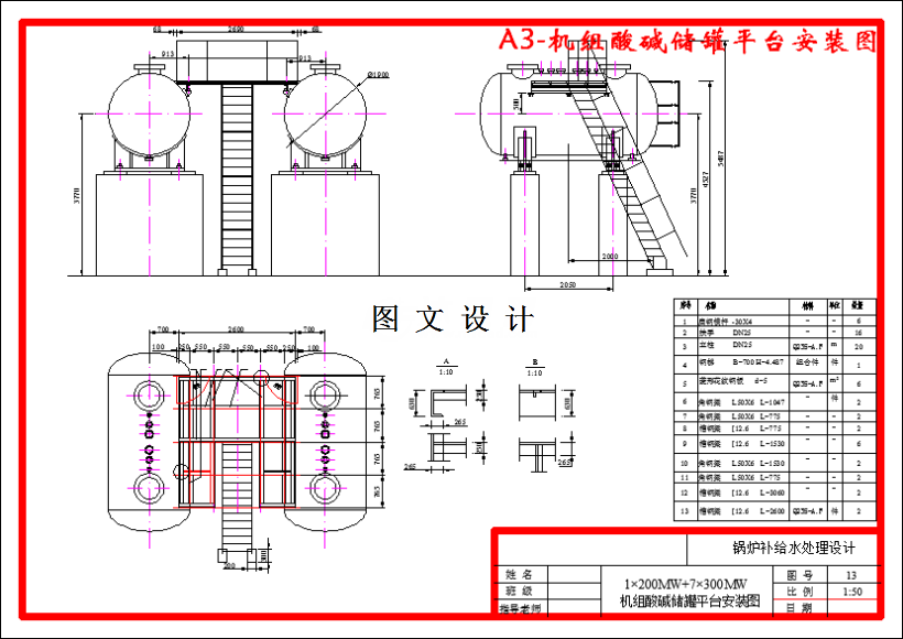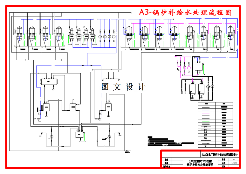1×200MW+7×300MW机组火力发电厂锅炉补给水处理课程设计(夏季水质),根据要求对自己课题(1×200MW+7×300MW机组)水处理系统进行了设计、计算,根据水源水质、总出力及各项水质指标要求比较,选择适合的水处理方案及设备,同时绘制了总体平面布置图、工艺流程图和主要设备结构示意图。补给水处理工艺流程是根据原水为湘江水、出水水质要求和机组容量的大小等因素综合确定的。 (1)原水水质悬浮物含量(实际含量为给出)大于50mg/L。因此需采用澄清池,过滤系统应用单层(石英砂)无阀滤池,采用接触混凝过滤方式,在反洗过程中,可以自动进行,无阀滤池的滤后水位位于滤池上部,便于操作人员观察,若水质不合格,能及时发现,及时处理,确保出水水质达标,其截污能力大,运行周期长,运行中水头损失增长较慢,实践中应用效果良好。 (2)除盐系统先采用弱碱—强碱复床+阳床一级除盐+混床交换系统,出水水质好能达到锅炉运行的要求。考虑经过无阀滤池混凝后,带入多余的强酸阴离子,强碱阴床不太符合水质要求,所以改用复床。 (3)原水水质全碱度为1.08mmol/L,大于0.5mmol/L,所以在阴床后面加设除碳器。体内再生混床选用直径为1.2m的两台,才能满足其实际运行流速的校验,所以不依据实际计算结果选用最佳的直径尺寸。