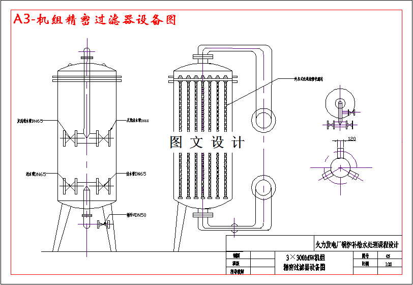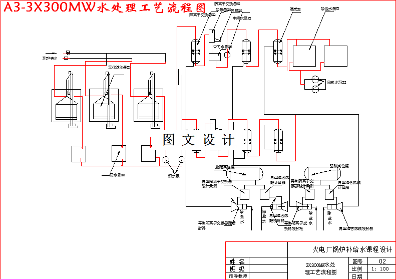 3×300MW机组火力发电厂锅炉补给水处理工艺课程设计(秋季水质),本设计根据《3×300MW火力发电厂锅炉补给水处理设计》的要求,结合《热力发电厂水处理》和《AutoCAD2000应用教程》等相关资料,根据水源、水质资料、电厂规模及水汽系统的水质指标等资料,通过计算选择恰当的水处理方案和主要设备,再运用CAD绘制设计出相应的主要单体设备图,并手工绘制工艺流程图、总体布局平面图。设计方案的是3×300MW火力发电厂锅炉补给水处理,是秋季水质。补给水处理工艺流程的选择是根据建厂的原始资料,如原水的水质和机组对水质和水量的要求等进行的,选择的方案能使处理后的水源水达到机组对水质的要求。包括预处理和后阶段处理两部分,因水源为河水,悬浮物含量较大,采用混凝,过滤处理;后阶段按照由前往后计算的顺序,(1).混床的确定:由水处理总供水量选择d=1500mm的定型混床,起截面积为1.76m2. ,选择正常时的混床台数为1台,最大为2台。(2).强碱阴离子交换器的选择,由前面混床设计的供水量确定阴床的供水量,进而确定阴床的总工作面积,选用直径为d=2000mm的定型阴床设备,其截面积为3.14,正常工作时的台数为1台,最大2台。(3).除碳器的选择,由前一级设备的总供水量确定除碳器的总供水量,选用直径d=1400mm的定型设备,其截面积为1.54,最大选择2台除碳器.(4).强酸阳离子交换器的选择,,由前面除碳器设计的供水量确定阳床的供水量,进而确定阳床的总工作面积,选用直径为d=2000mm的定型阴床设备,其截面积为3.14,正常工作时的台数为1台,最大2台。(5). 无阀滤池的选择,由滤池设计的供水量选择3台滤池的设备台数。