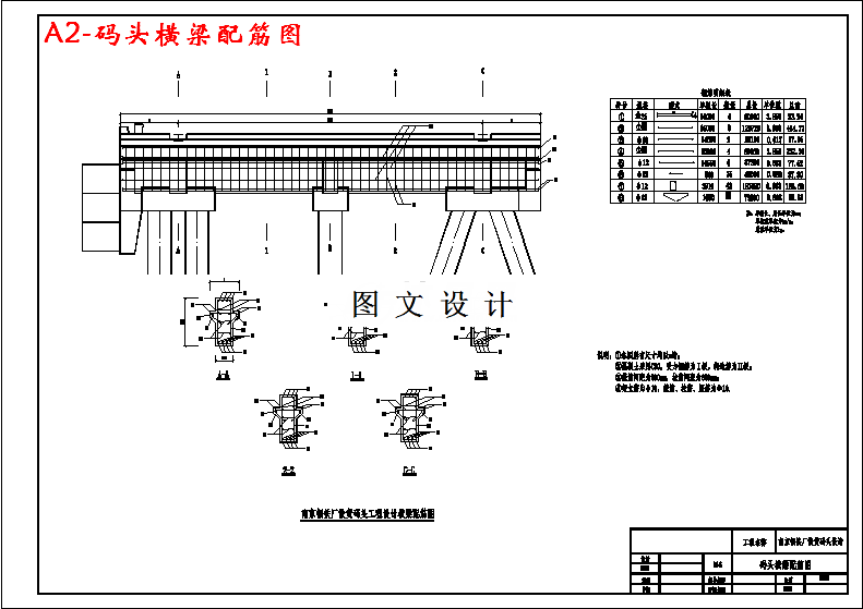 为充分发挥码头优良深水岸线及后方场地的作用,适应市场经济发展的需要,现需要将南京钢铁厂码头改建成一个10000吨级钢材码头,主要用于钢材同时兼顾少量的水泥、砂、石等材料的装卸。通过分析南京港的地质和水文资料,经过方案对最终在设计中采用高桩码头设计方案。高桩码头按上部结构可分为板梁式、桁架式、无梁板式和承台式码头,通过分析几种形式在经济、工程难度、施工条件等各方面因素的考虑,本设计决定采用高桩板梁式码头方案。总平面布置设计涉及钢材码头的泊位计算和泊位利用率的验算,码头平面的陆域和水域的布置。通过总平面的设计,初步确定港区前沿水深,航道水深,码头线长,锚地,堆场和库场面积等。经计算本设计拟建泊位1个。装卸机械的设计确定了本设计所要采用的各类机械的技术指标和各种机械所需的司机和装卸工人数目,如叉车、牵引平板车、门座起重机。结构的设计主要有结构方案比选和拟定,对码头所受到的各种荷载计算,包括风荷载,水流力、系缆力、挤靠力、撞击力,然后构件尺寸拟定和估算。结构计算仅计算面板和对面板进行配筋。最后,采用CAD绘出码头总平面布置图,装卸工艺图,板梁平面图、码头结构断面图,面板配筋图。