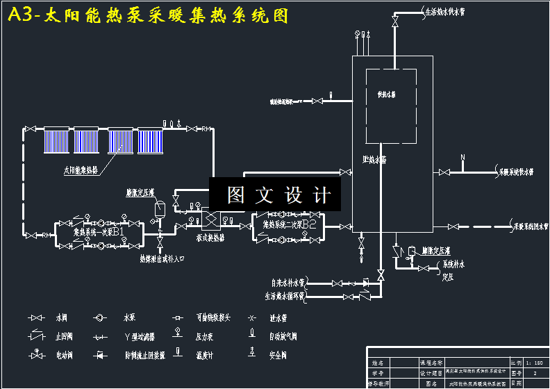 本次设计以北京市某音乐花园联体别墅,其中有会客厅、影院厅、休息酒吧等功能用途的房间。层高为3.3m或3.6m,主要进行太阳能供热系统的设计。在设计中先确定供暖系统方案,然后进行建筑物的热负荷计算,其中建筑物面积1958.26m,总热负荷为81644W,单位面积指标为41.69W/m。末端装置设计计算、采暖系统水力计算、太阳能集热器以及热泵系统、蓄热水箱、循环水泵等的选型设计计算。本次计算采用了低温热水地板采暖设计,设计热水采用60℃,供回水温差10℃。平均水温取55℃。最后进行能耗分析。