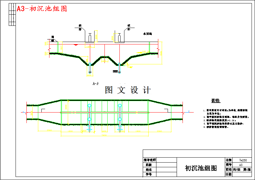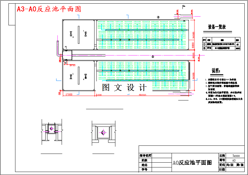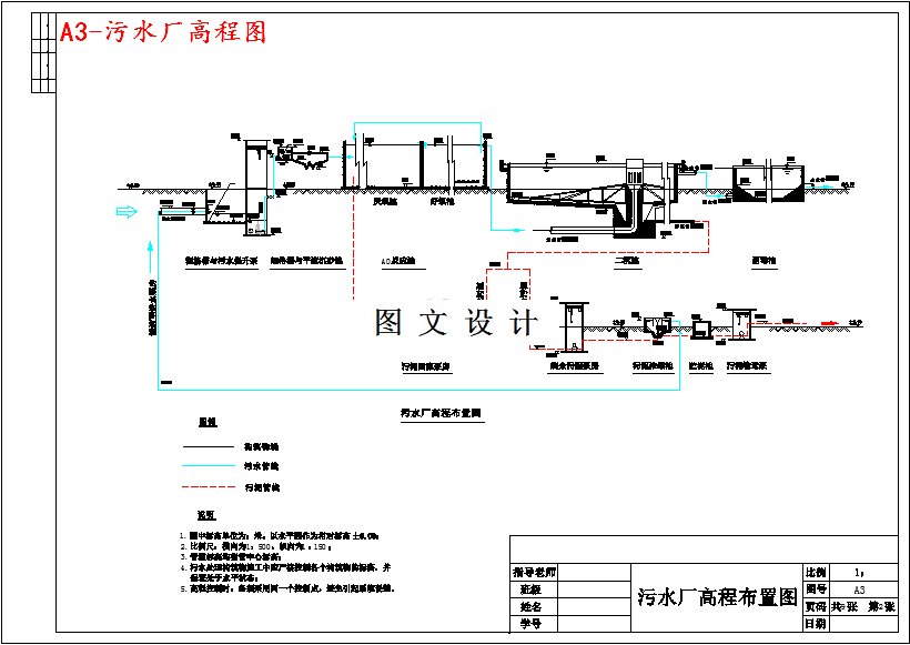 10000立方∕天生活污水综合处理设计。本项目设计进出水水质根据生活污水来源和《城镇污水处理厂污染物排放标准GB18918-2002》一级A标准列出,采用基本控制项目最高允许排放浓度。由于CODcr、BOD5 、SS、NH3-N、P去除率均较高,需采用生物处理法。选用A2/O工艺,同时对污泥和臭气进行处理。设计图集:平面布置图、高程图、主要构筑物结构图、设备一栏表、材料一栏表。