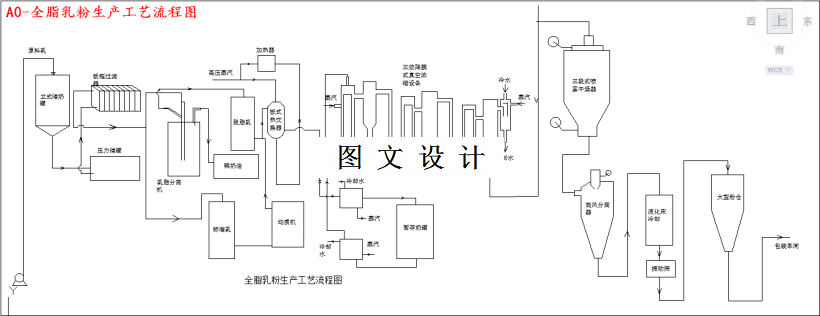标准化原料乳固形物含量11.6%;浓缩操作应去除原料乳中70%-80%的水份、每蒸发1kg水份蒸汽消耗不高于0.4kg ; 喷雾干燥的热效率不低于50%、产品的含水量不高于2.5%。 吨产品其主要的原料及动力消耗为: 1.鲜牛乳9.09吨 2.水:50吨 3.蒸汽:5.26吨 就该乳粉车间进行工艺设计,要求完成: 1.确定合理的工艺路线,提供工艺流程示意图; 2.进行工段的工艺计算,包括物料、热量、水、压缩空气耗量等计算,并提供相应的工艺计算平衡图; 3.对标准设备及非标设备的数量进行计算,选定标准设备型号并就至少一种非标设备的结构进行简单的结构计算,提供所需设备的一览表并至少提供一种非标设备的总装图。 4.绘制带控制节点的工艺流程图; 5.绘制车间设备布置图。