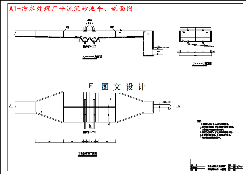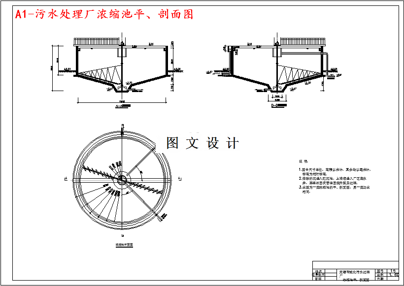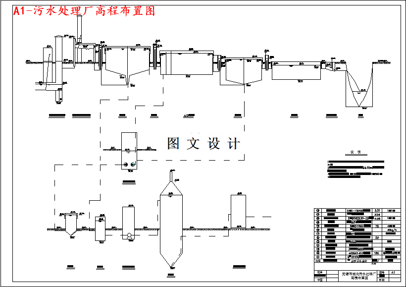 本设计污水厂污水量为11万吨,采用职工人数为52人。管理人员及干部13人站30%,工人39人占70%。设计内容与要求:污水及污泥处理工艺方案比较和处理构筑物的选型;污水处理工程水处理构筑物的设计计算;污水处理工程污泥处理构筑物的设计计算;污水处理和污泥处理高程的计算;污水处理厂的工程概算。(1)污水处理厂工艺及污水回用总平面布置图1张,包括处理构筑物、附属构筑物、配水、集水构筑物、污水污泥管渠、回流管渠、放空管、超越管渠、空气管路、厂内给水、污水管线、中水管线、道路、绿化、图例、构筑物一览表、说明等;(2)污水处理厂污水和污泥及污水回用工程高程图布置1张,即污水、污泥处理高程纵剖面图,包括构筑物标高、水面标高、地面标高、构筑物名称等;(3)污水总泵站或中途泵站工艺施工图1张;(4)污水处理及污泥处理工艺中单项构筑物施工平面图和剖面及部分大样图5张;(5)污水回用工程中主要单位构筑物的工艺施工图1~2张;