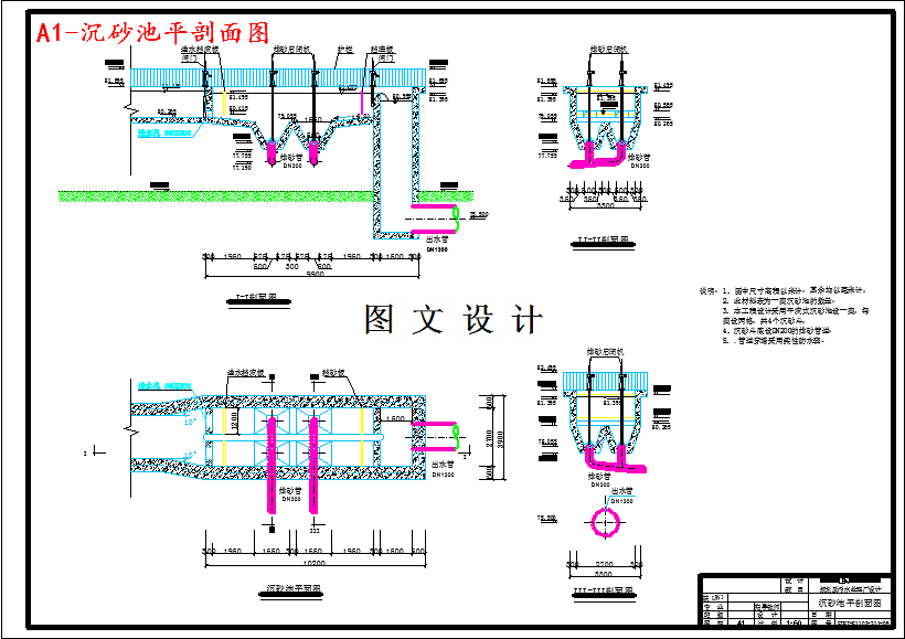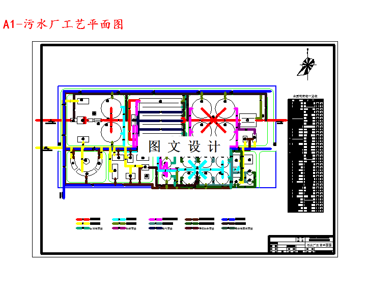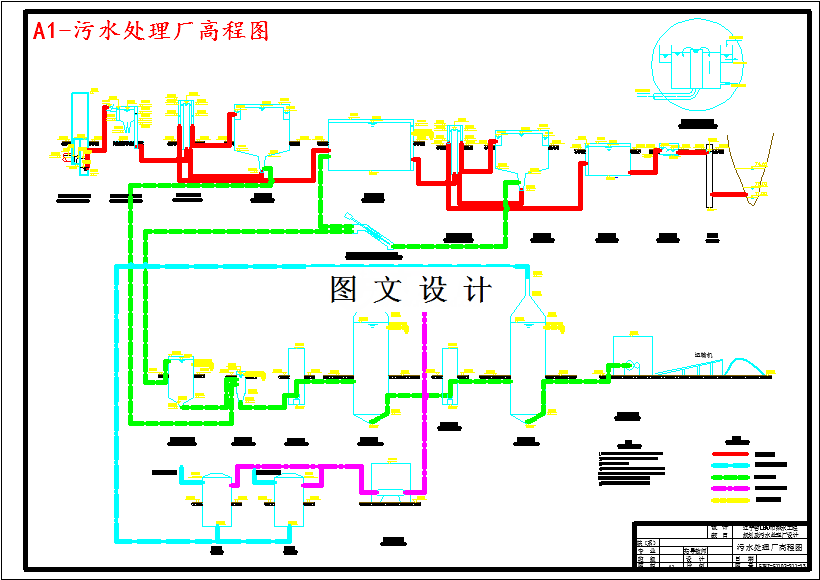 本市区面积和约为436.33公顷,人口约为33.1万,被一条铁路分成南北两部分,其中还有三个规模较大的工厂。一区的人口密度为370人/公顷,污水量标准180升/(人·日),二区的人口密度为390人/公顷,污水量标准150升/(人·日)。在城市的南部有一条自西向东流动的河,常年主导风向为西南风,冰冻深度是1.0米,地下水位是7米。为了减少投资和降低管道埋藏深度,我们在布置管网时考虑一定要充分利用地形地势。排水体系需要收集城市的生活污水,工业废水,以及雨水三部分。排水体制采用分流制体系,尽管在造价上比合流制高一些,但是在处理的难易程度和效果上来说,分流制都要比合流制合算的多。根据实际情况,污水厂建在城市的东南角,远离城区,占地约4.5公顷,日处理污水量5.89万方,进厂污水的含氮、磷比较高,需着重进行脱氮除磷处理工艺。污水厂的水处理分为一级处理、二级处理、深度处理和污泥处理。其中,一级处理包括格栅,污水泵站和沉砂池;二级处理采用了A-A-O生物脱氮除磷处理工艺,通过微生物的新陈代谢将污水中的大部分污染物转化为CO2和H2O。污水经过初沉池,A-A-O反应池,二沉池,混合池等主要的构筑物进行逐步处理。通常情况下,经二级处理的水已达到排放的标准,可以直接排放到工厂附近的水体,不会给环境带来严重的污染问题。污泥处理工艺采用中温厌氧二级消化,污泥最后由离心脱水机脱水后外运卫生填埋。同时将污泥进行消化时产生的沼气作为再生能源加以利用,达到能源的合理分配。 经过该工艺处理排放的污水水质达到国家《城镇污水处理厂污染物排放标准》(GB18918-2002)一级A标准的要求。城市污水得到有效控制,减少其对环境的污染,为城市的发展取得了很好的环境效益、社会效益和经济效益。本工程处理效果好,能耗低,场内构筑物聚集,自动化程度高,管理方便。