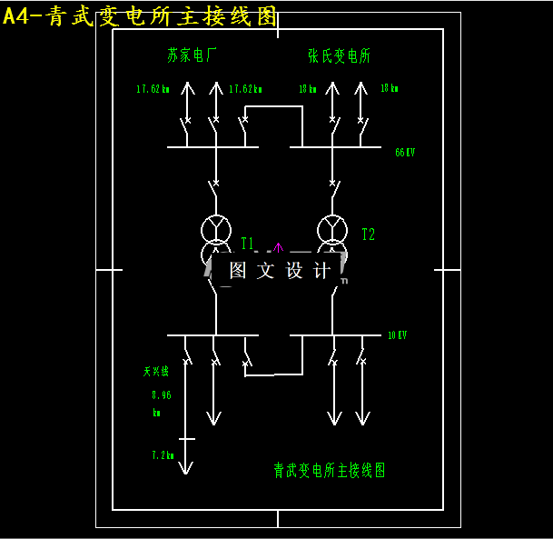 本次设计的内容是青武电所继电保护设计,其目的是通过在电力系统中装设一些继电保护装置,以保证当电力系统中某电气元件发生故障时,能自动、迅速、有选择地将故障元件从电力系统中切除,避免故障元件继续遭到破坏,使非故障元件迅速恢复运行;并且保证当系统中电气元件出现不正常运行状态时,如三相短路、两相短路、单相接地短路、两相接地短路、变压器绕组间的匝间单相断线、两相断线、过电流、过负荷、还有线路的保护等,能及时反应并根据运行维护的条件发出信号或跳闸。 主要采用的保护有瓦斯保护、变压器差动保护、过电流、过负荷、距离保护。 本次设计是我们在校期间进行的最后一个非常重要的综合性实践教学环节,也是我们学生全面运用所学基础理论、专业知识对实际问题进行设计(或研究)的综合性训练,同时还是我们将来走向工作岗位而奠定的基本实践。通过本次设计可以增强我们运用所学知识解释实际问题的能力和创新能力,以便更好地适应工作的需要。 电力系统继电保护的设计与配置是否合理,直接影响电力系统的安全运行,故选择保护方式时,满足继电保护的基本要求。选择保护方式和正确的整定计算,以保证电力系统的安全运行。