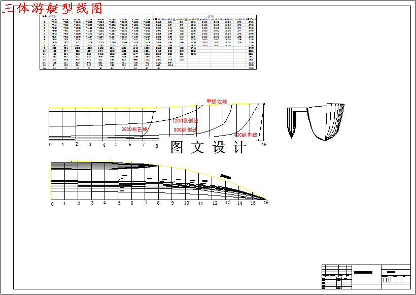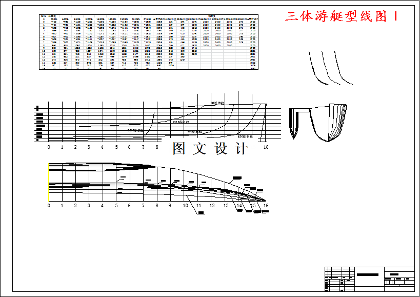 本次设计的具体任务为三体游艇的方案设计,该船航行于我国近海区域。 在设计过程中着眼于确保船舶的适用性,保证其能够较好地完成设计任务书中规定的使用任务。本次设计涉及多个方面,大体上来说,可以分为下面六个部分: 1、主要要素确定 根据设计任务书的要求,初步确定设计船的主尺度、船型系数和排水量等主要要素,并对其稳性、航速、容积等进行校核,最终确定设计船的主尺度。 2、型线设计 根据已经确定的主尺度,水线以上部分自行设计,考虑型深、布置等方面的要求,同时注意与水下部分型线的配合,最终得到设计船的型线图。 3、总布置设计 按照规范要求并参考60ft豪华游艇母型船进行总布置设计,区划船主体和上层建筑,布置舱室设备。 4、静力学及完整稳性计算 对设计船的装载情况、浮态、初稳性、完整稳性等进行计算,并绘制静水力曲线、舱容要素曲线、稳性横截曲线、静稳性曲线和动稳性曲线等,以确定设计船满足设计任 务书和规范的要求。 5、快速性计算及喷水推进器的概述 介绍喷水推进器的外形结构和工作原理,分析喷水推进器的特点及优势。 6、船体结构设计 按照按照CCS《游艇入级及建造规范(2012)》和《高速艇设计建造手册》的规定,对设计船进行结构设计,选取构件,并校核总纵强度,以保证结构设计合理。最后绘制典型横剖面图。
