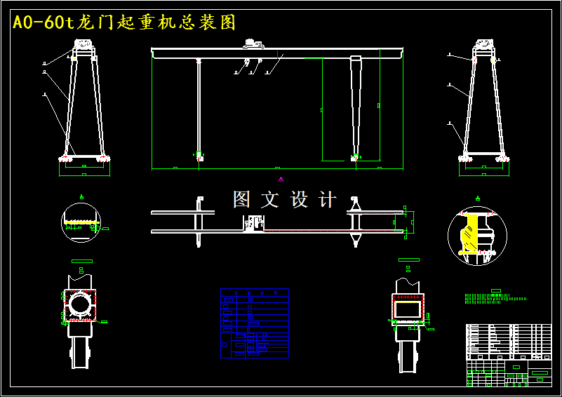 龙门起重机主要设计参数:60t龙门吊设计,跨度50M最大起升高度35M,龙门起重机是用来对货物进行起重、运输和安装作业的机械。它与现代化社会生产活动有着密切联系,它可以减少工人劳动量,并且增加生产效率、在安全生产的前提下高效率作业的重要辅助机械。 随着我国重工业和建筑运输行业的发展,对起重机的起重量和起重精度的要求也逐步提高,为应对不同领域对起重机的不同要求同时也为方便生产,现代化专门化的起重机也相继产生,在我国经济建设中有着很大积极作用。本设计首先介绍了起重机的研究背景和意义,以及起重机的国内外发展现状和发展趋势,然后根据60t-35m龙门起重机主要参数,完成了龙门起重机的总体设计。进行了运行机构和起升机构设计,并且校核了主梁支腿及连接部分载荷。