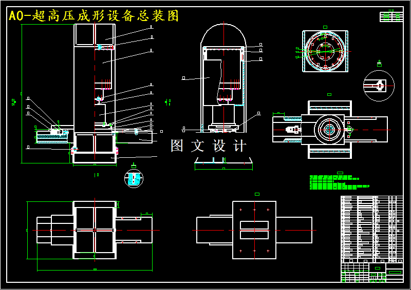 本设计的超高压成形设备,主要是用于加工成形厚度为2mm至3mm的铝合金的钣金。加工的工艺如下所示: (1)取厚度为3mm、直径为500mm的圆形薄板钣金毛坯至超高压容器的上方,同时用压块对薄板进行压边处理。 (2)启动滚珠丝杆处的电动机,滚珠丝杠带动滑块,滑块带动超高压容器运动,直至超高压容器运动到大型液压缸的正下方,关闭电动机。 (3)启动上方的四个小液压缸,使套筒向下移动,直至超高压容器的上方停止。 (4)启动大型液压缸,向下冲压,完成钣金的成形,随后恢复到初始状态。 (5)套筒上移至原始位置。 (6)超高压容器继续向前运动,远离大型液压缸。 (7)拿下压块,取出钣金件。 (8)超高压容器恢复至初始位置,完成一次成形过程。
