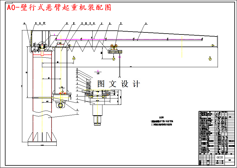 悬臂起重机是一种中、小型的起吊运输设备,起吊重量为0-1250kg,有机械传动、液压传动和气动等几种型式。目前国内应用最广的是机械传动,机械起重机通常是用螺旋副驱动装置通过四连杆吊臂带动吊物升降。悬臂起重机按构造分,有立柱式悬臂起重机和壁式悬臂起重机。悬臂起重机具有结构新颖简单、操作使用方便、回转灵活作业空间大等优点,是节能高效的物料吊运装备可广泛使用于车间的生产线、装配线和机床的上下工件及仓库、码头等场合的重物吊运。本机由立柱、回转悬臂及环链电动葫芦等组成。立柱下端固定于混凝土地面上,悬臂可根据用户需求进行回转。回转部分分为手动回转和电动回转(安装摆线针轮减速器与上托板配合或者下托板带动转管悬臂回转)。