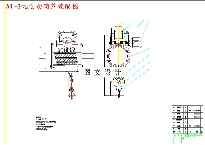 起重机是用来达到安全生产,提高工作效率,减轻繁重的体力劳动的起重运输机械,起重机械的主要部件之一是电动葫芦。它主要弹性联轴器,运行装置,卷筒部件,速度控制器,吊钩部件,锥形转子电机等部分构成。本设计根据要求,对3t单钩电动葫芦的三维设计选择和确定整体方案,然后对葫芦进行整体设计。根据设计任务书要求,首先参考CD1型电动葫芦对3t单钩移动电动葫芦进行工艺分析和设计,确定合理机构及装配方案,然后进行电动机和减速器的外形设计,钢丝绳的技术及选用,卷筒部件的设计,再验算齿轮的传动比,选定所需齿轮的参数,并进行载荷强度计算,已确保轴承、键、轴套等各种零部件的合理性,通过SolidWorks画出葫芦装配图。最后对所用弹性联轴器做出一定计算。