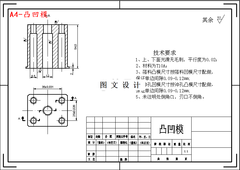 该零件材料为08钢结构简单,抗剪强度为300mpa形状对称,只有落料,冲孔两个工序具有良好的冲压性能,适合冲裁。工件结构相对简单,有一个φ10mm的孔四个φ6.5mm的孔;孔与孔、孔与边缘之间的的距离也满足要求,最小壁厚为4.25mm。该冲裁件包括落料和冲孔两个基本工序,可采用的冲裁方案有单工序冲裁,复合冲裁和级进冲裁三种: 方案一、单序模:零件属于中批量生产,因此采用单工序须要模具数量较多,生产率低,所用费用也高,不合理; 方案二、:复合模:若采用复合冲,可以得出冲件的精度和平直度较好,生产率较高,凸凹模最小壁厚为3.2mm。 方案三、级进模:大批量生产、冲裁精度较高,冲裁件孔与孔、孔与边缘尺寸较小时使用,计算该件的最小壁厚为6mm。 综上所述可选方案二复合模。