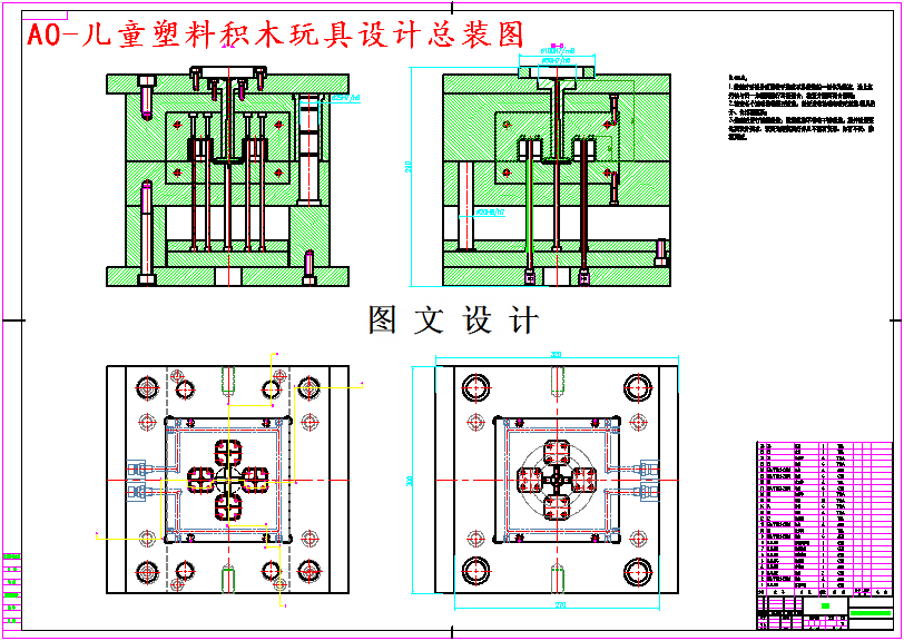 该塑件采用的是一模四件成型,所以,型腔按品字型放置。这样也有利于模具的平衡。本设计 以医用塑料儿童积木为对象,详细介绍其注射模设计过程。设计中主要运用了不同的软件分别对塑件的结构、注射模成型部分零件、浇注系统、脱模机构等等进行了仿真设计和分析。最后进行了注射机型号的选择及校核、分型面的确定、型腔的设计、抽芯机构的设计、成型部分零件的设计、浇注系统、冷却系统、排溢引气系统、脱模机构的设计,复位系统的设计及其它零部件的设计。