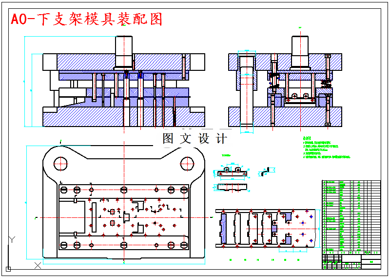 在本设计中,题目是下支架级进模具设计。拿到设计的钣金件以后,首先要进行结构等一系列分析,下支架的外形比较简单,属于一般结构外形。出来外形的成型外,还有冲孔和弯曲两个主要工序,其中弯曲还要分为多处弯曲,初步确定采用级进模完成,通过这个模具的设计,设计过程中,要对下支架的结构性、材料进行分析,选择合适的方式进行生产。通过材料的分析来确定工件是否适合生产。之后要通过工件的厚度来确定工件排样图的搭边,然后计算排样图的材料利用率。完成后,需要计算冲裁力,结合计算的总的冲压力,选择合适的冲压设备。模具刃口的计算也有其的重要,只有选择合适的刃口才能够确保模具的寿命,提高模具的使用率。模具刃口计算后,就是模具的结构设计,凹模外形的设计比较重要,因为后面的零件设计都要以凹模为基准,确定了凹模尺寸之后,其他零件的尺寸就确定了,最后选择模架等一系列标准件,最终完成模具的设计。