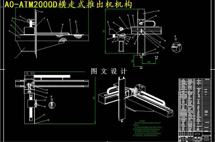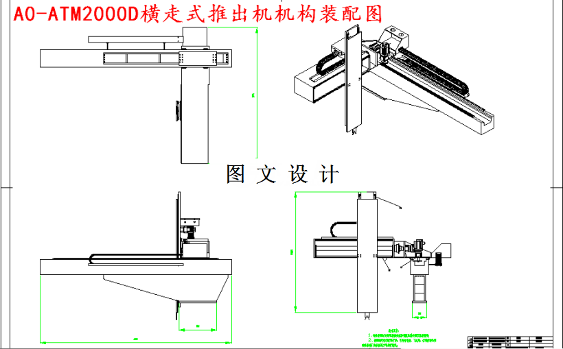 本设计主要进行了ATM2000D横走式取出机构的设计。ATM2000D横走式机械手是注塑机专用机械手的一种。注塑机专用机械手提高注塑成型机的生产效率、稳定产品质量、降低废品率、降低生产成本、增强企业的竞争力等方面起到及其重要的作用。它以交流伺服电机为动力源,用齿轮齿条和滚珠丝杆作为传动元件,通过齿轮和螺母的移动实现三个方向的直线移动,从而实现机械手的移动。机械手横走和上下方向的移动由齿轮齿条实现,引拔方向的移动由滚珠丝杆实现。