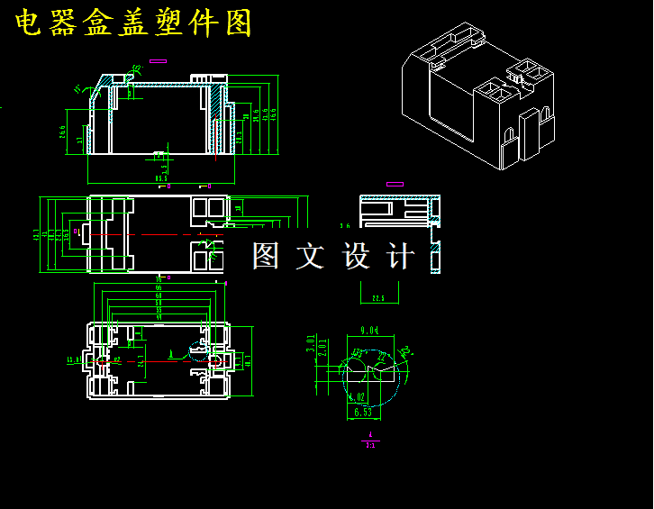 本次设计题目是某电器盒盖塑料模设计。其内容包括了设计塑件的工艺性分析,塑料模具结构设计、注射机的选定、模具3D设计、零件2D平面图绘制、模具零件的设计、零件工艺性设计,加工设备的选择。本文针对塑件模具设计,模具零件认识、模具零件设计,模具零件加工工艺性设计、零件加工设备的选用,均在本次模具设计思路、设计过程、设计方法、设计特点方面做了详细的分析与说明并以简洁的文字和丰富的图形表现出来。