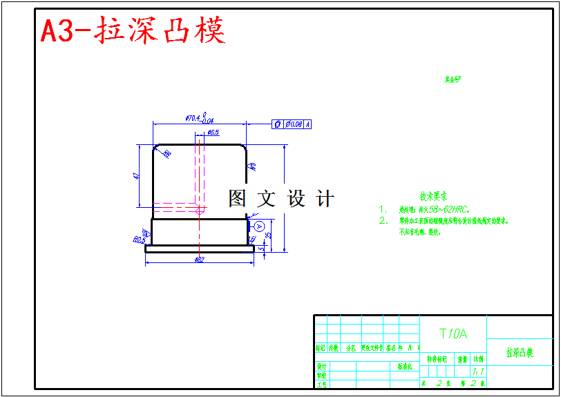 该零件为锥形阶梯筒零件,工件需要拉深完大径之后再在拉深小径的过程中拉深出锥面。08钢材料是非常软的碳素钢,强度和硬度也是很低的,但是韧性和塑性却是非常高,具有良好的冲压性能,对弯曲,拉深,镦粗等冷加工性能也很好。由于该零件拉深程度较高,所以要求材料的塑性更好,因此选择的材料为08钢。该制件为两阶梯间用锥面连接的阶梯直径的大小相差比较大的梯形零件,就先拉深出大径,再在拉深小直径的过程中拉出侧壁锥形。