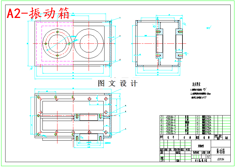 本次设计是利用AutoCAD 2006 软件完成稳态激振装置的设计。设计内容主要包括总体结构分析、总体结构设计和主要零件的设计及校核。总体结构分析由激振器的原理及分类、偏心块的选择和主体结构分析三部分组成;总体结构设计主要包括传动结构设计、箱体结构设计、导向结构设计和支撑结构设计;主要零件的设计及校核是对带传动、齿轮、主动轴和从动轴等零件的设计及校核。