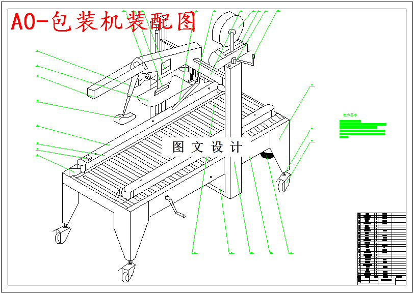 本设计的是全自动包装机,采用的是两侧摩擦带驱动来进行密封纸箱的方案。本设计的全自动包装机,可以根据纸箱的大小,调整工作区的宽度和高度,可以单独工作,也可以和自动化包装线组在一起匹配使用;包装机工作的时侯,把纸箱从机台输入端推入(箱子顶部的封口盖须竖起来),被摩擦带带动的时侯就可以松开手了,当纸箱运动到折盖的挡板时侯,装备的气缸活塞开始工作,它可以推动后折盖摆锤升起,当纸箱全部经过折盖控制的挡板时侯,折盖的控制系统会复位,然后气缸活塞就会收缩,后折盖摆锤落下,敲下纸箱的后盖,纸箱两侧的盖在摆杆作用下完成侧盖折盖的动作,即可完成折盖封箱目的;折盖顺序为:前盖、后盖、左右侧盖, 当纸箱运行到胶带封箱位置时,箱体在运动压力的作用下将刀架和前胶带压轮压退位,而后面的压轮会在四杆装置的作用下,与前面的压轮保持相同方向运动地退位,会使前面装的胶带与纸箱粘贴并密封纸箱;随着纸箱运动的前进,胶带会不断地抽出粘贴在纸箱的盖上,当纸箱的后部远离密封箱装置时,前面的胶带压轮由四杆装备的作用与后胶带压轮的运动保持一致,而刀架会受到弹簧反弹的作用,回到原来位置弹起,切断粘贴的胶带,当纸箱运动到离开后胶带压轮的时侯,后胶带压轮也会受到可调动弹簧回复作用而复位,会使连接在纸箱上最终的胶带也贴在箱体上,完成后段封箱任务。