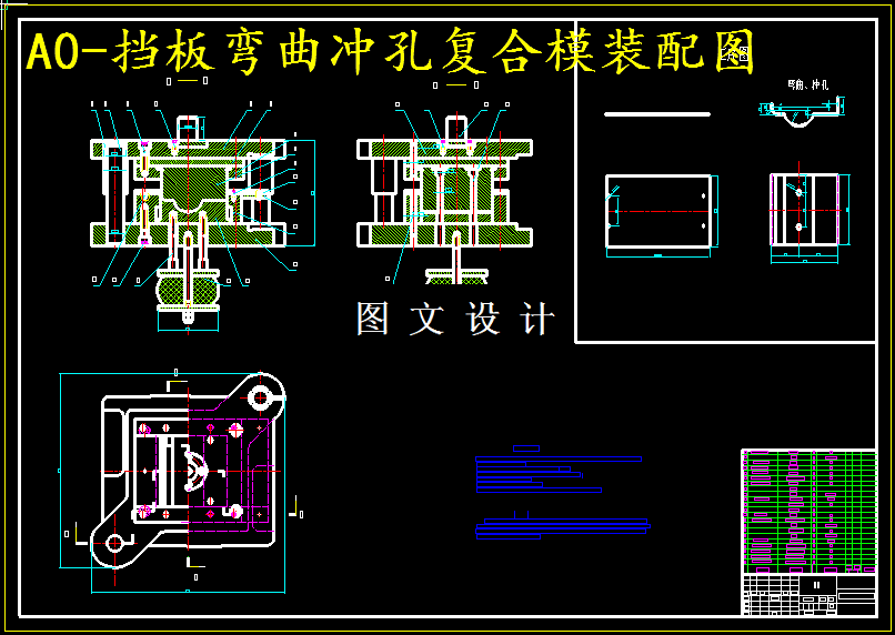 本模具是一套弯曲冲孔复合模。采用手动送料的形式,当板料从模具右方送进时,依靠承料板11辅助承接板料,以及导尺10和挡料销18的导向定位对板料进行弯曲冲孔,一次完成,因为本冲压件尺寸较大,为节省制作凸凹模的材料,所以采用镶块形式,冲孔废料从模具下方取出,采用弹性卸料装置卸料。