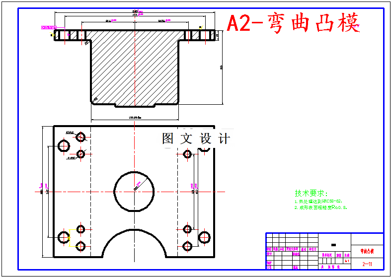 此次课程设计的课题只设计弯曲工序,故只需设计弯曲模,因为零件各孔边缘到弯曲范围的距离大于二倍料厚(即B>2t),故完全可以先冲孔后落料,即此次设计只设计弯曲工序,且冲孔可和落料在一套模具上完成。技术要求: 1:打模具编号 ; 2:选用100KN开式压力机; 3:弯曲模配合加工,保证双边间隙在0.26之间,配合加工; 4:上下模座的平行度保证在小于0.8; 5:模柄中心线对于上下模的垂直度保证在大于0.05; 6:导柱导套之间要润滑,加润滑油; 7:上模板离导套的距离和下模板离导柱的距离要小于1mm.