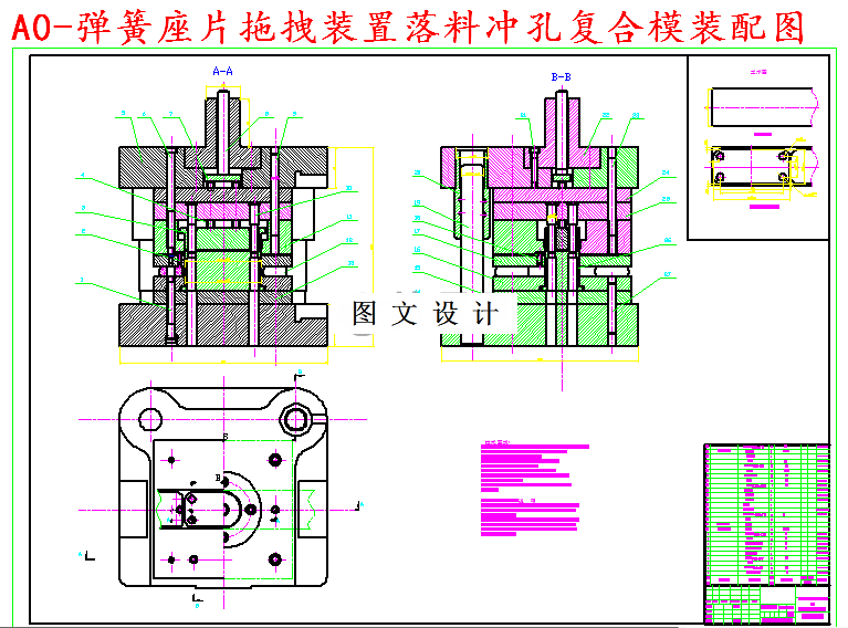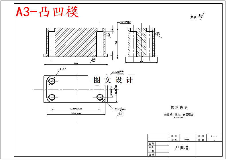 本套模具采用倒装式复合模结构,冲孔废料可以直接从模具写的废料口掉出,模具周围清洁,更重要的是避免了人手工取出废料带来的安全隐患。冲压件的外轮廓是由四个直径相等的圆弧和四条直线组合而成的,所以曲线不多,形状规则,是简单的外部轮廓。内部有圆孔,是规则的形状。所以该件的冲压模具的落料模稍复杂,而冲孔模则简单。另外,冲裁件轮廓图形上,直线与直线用圆弧过渡。这样不仅使模具制造简单,模具磨损慢,而且减少了模具制作工序,提高了生产效率。从冲件形状来看,该件需要的工序有下料、落料、冲孔。