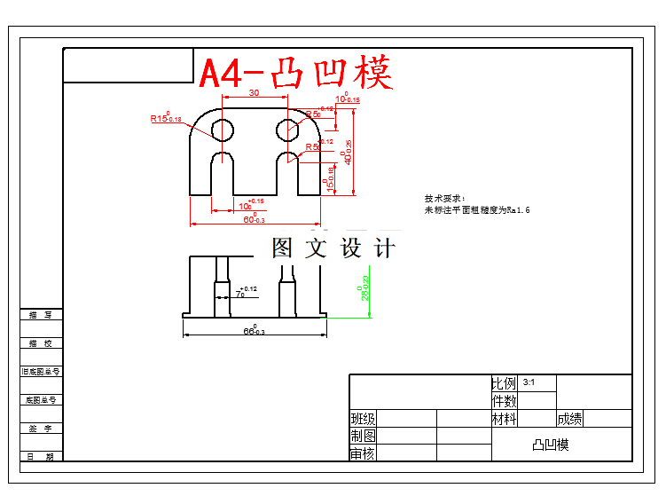 工件大批量,材料为10钢,t=1mm设计该工件的冲裁工艺和模具。此工件只具有落料工序,材料为10钢,t=1mm塑性、韧性良好,易冷热加工成形,工艺结构简单。该工件按12级精度补标工件尺寸公差。按“人体”原则把它们逐个改为单向公差(目的是方便与以后的刃口尺寸计算)。经分析,工件尺寸精度要求不高,形状不复杂。且不大,但工件产量较大,根据材料的稍厚(1mm)特点,卸料力较大,为保证较高的生产率,采取刚性卸料、挡料块定位、使用带料(或条料、卷料)和漏料方式的冲裁模结构形式最佳。采用复合模生产。