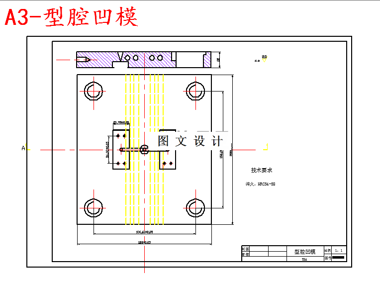 本制件的外围尺寸为57×24mm。本制件为开关盖,对之间的精度和表面粗糙度要求不高,所以取公差等级为5级,表面粗糙度为Ra 0.5 .成型方式为注射成型,一模两腔.根据塑件的结构形式,分型面选在开关盖的底平面确定型腔数 :该塑件精度要求不高,又是大批量生产.考虑到模具制造费用和制件尺寸,初定为一模两腔的模具形式. 本模具拟用一模两腔,推杆推出,浇口采用侧浇口.型芯中有四个小型腔,其中有四个小型芯一起固定在型心固定板上.