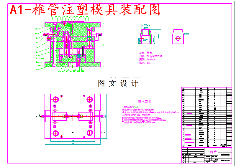 该塑件是椎管,塑件属薄壁塑件,生产批量大,材料为改性聚苯乙烯。处于黏流态的聚苯乙烯,其黏度对剪切速率和温度都比较敏感,在注射成型中无论是增大注射压力或升高温度都会使熔融度下降。因此,聚苯乙烯即可用螺杆式也可用柱塞式注射机成型。料筒温度可控制在140~260℃之间,喷嘴温度为170~190,注射压力为60~150pa。依据对塑件结构的分析,采用矩形浇口浇注,因此采用两板式单分型面。