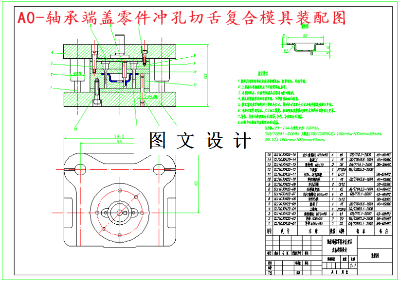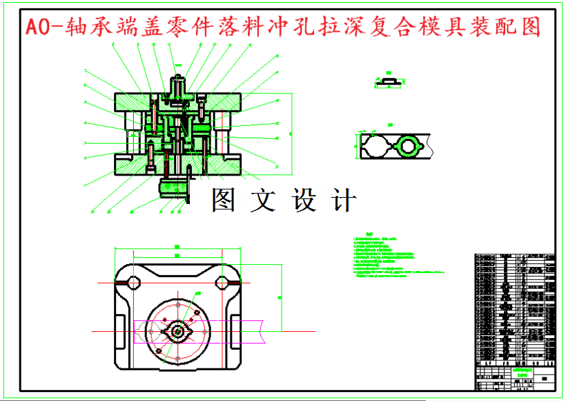 本次设计为轴承端盖外壳零件成形工艺及模具设计,通过分析零件的加工需要冲孔、落料、拉深及切舌三个工序。考虑到零件较薄,批量较大,选用冲孔落料拉深复合模和切舌模的工艺方案。利用我们所学的知识,达到学以致用。首先,对轴承端盖外壳零件做全面的研究。内容有:结构分析、零件精度、工序安排。合理的排样,可降低成本,选用合适的方案。工艺的分析计算内容包括合理的方案和工序安排,根据零件计算冲压力,选择合适的压力机。接着进行模具刃口的选择和计算,需要选择合适的凸凹模间隙,这样才可以提高模具寿命,刃口的精度才能得已保证,则零件精度得到保证。根据结构的设计和工作过程分析选用合适的标准件,完成装配图。最后进行校核模具高度和压力机校核,以满足实际生产需求。
