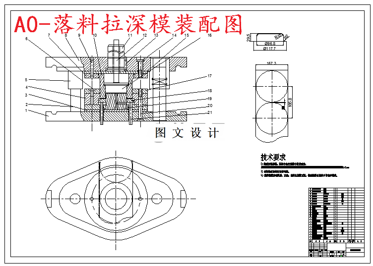 本设计主要根据给定的离合器轴承外罩零件图及其技术要求,进行该工件冲压工艺设计以及所用的冲压模具图设计。 涉及的工件主要采用的工序为落料、拉深、冲孔、切边,先设计三种工艺方案,进行比较分析,最后确定其中一套最为合理的方案进行详细的分析其工艺过程。需要对各工序的工艺尺寸进行计算,有毛坯尺寸、拉深极限、拉深力、冲孔力计算等。并设计冲压模具总装配图和模具零件图,采用CAD计算机绘图软件进行绘制。