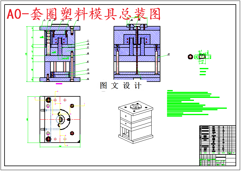 本设计主要是针对给定塑件套圈的注模具设计,给定材料为PA66,借助Moldflow通过对塑件的工艺性以及产品的外形进行分析,并利用AutoCad绘制装配图和注塑模具型芯、型腔及重要零部件零件图。本说明书以图文结合的形式,对浇注系统、分型面、模具成型部分的结构、推出机构、冷却系统都有了较详细的论述和计算,并对此次设计进行了反思和总结。