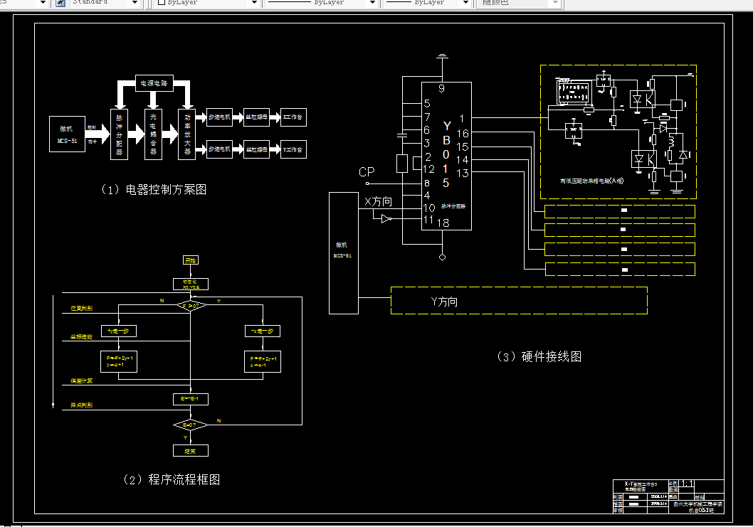 X-Y数控工作台设计包括总体方案的设计、步进电机的选用、机械传动装置的设计、电气控制部分的设计和相关软件的设计。本设计的经济型数控工作台精度并不高,采用开环系统;机械传动部分采用联轴器将步进电机直接与滚珠丝杠连接,从而驱动工作台进给。另外,选用MCS51-8031单片机和相应的驱动电路对X和Y两个方向的步进电机进行开环控制。