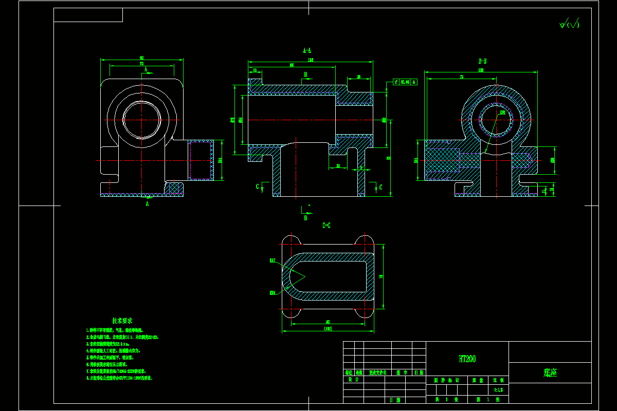 课题是底座零件的机械加工工艺及夹具设计。从图纸中可以清楚的知道,底座是传动型零件的箱体,通常是被铸造成灰铸铁,它必须有很强的刚度以及强度来抵抗它的传动系统引发的振动。需要正确的解决在加工的程序里零件的定位和夹紧跟工艺路线的布置和工艺尺寸大小的确定等一系列因素,然后设计出专用的夹具来确保零件的质量。这种设计是必须要培养自主学习以及自我创新的能力。所以这种设计是全面和实用的,涵盖广泛的知识。 因此,我们不仅要关注设计中的基本概念,也需要关注生产实践。把理论和生产实践结合起来,我们才能完成好这次的设计。
